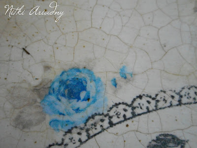 Decyzja była prosta - róża za jedyne w swoim rodzaju, takie bardzo "agnieszkowe" postarzane pudełko z niebieskimi nutami. Po obopólnej zgodzie, zabrałyśmy się do pracy. Pozwólcie, że pominę milczeniem czas, jaki zabrało mi stworzenie tego haftu... Wstyd, po prostu wstyd! I nie było to wcale spowodowane niechęcią do ponownego wyszywania tego samego wzoru - widocznie hafty zielnikowe nie podlegają regule, że przy drugim podejściu do haftowania tego samego cierpię męki wzorem Tantala;) Ostatecznie po dłuuugim czasie gotowy haft mógł powędrować na Różaną.